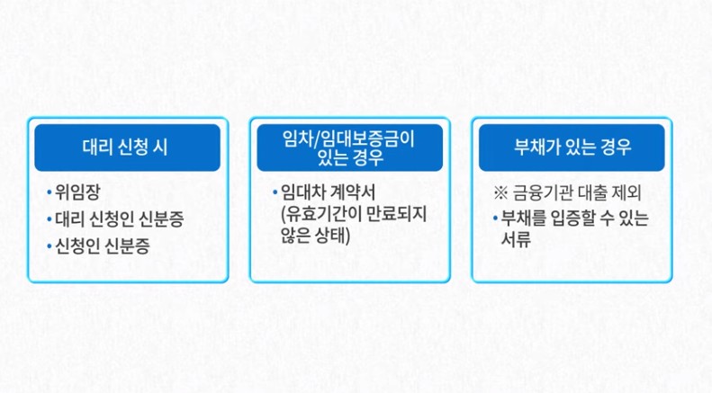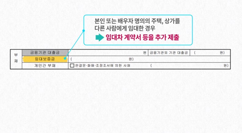 - 재산 사항 작성: 본인과 배우자가 소유한 재산을 모두 기재합니다. 특히 임차보증금은 반드시 작성되어야 합니다. 이를 입증하기 위한 증빙 서류도 함께 제출해야 합니다.