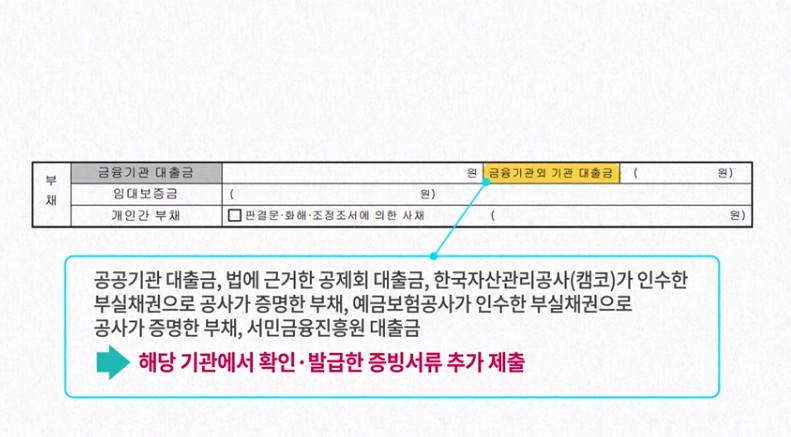 부채 항목은 부채를 제외한 재산 가액을 정확히 기입해야 합니다. 금융기관 대출금부터 개인간 사채까지 모든 부채를 포함시켜야 하며, 이를 입증하기 위한 증빙 서류도 함께 제출해야 합니다.