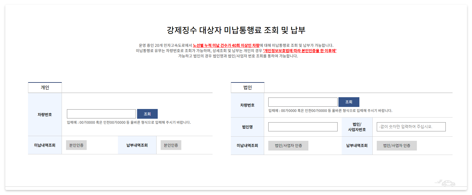 2. 새 창으로 강제징수 대상자 미납통행료 조회 및 납부 창이 뜹니다. 이곳에서 차량번호로 조회하면 노선별 누적 40건 이상 미납내역 조회 및 납부가 가능합니다.