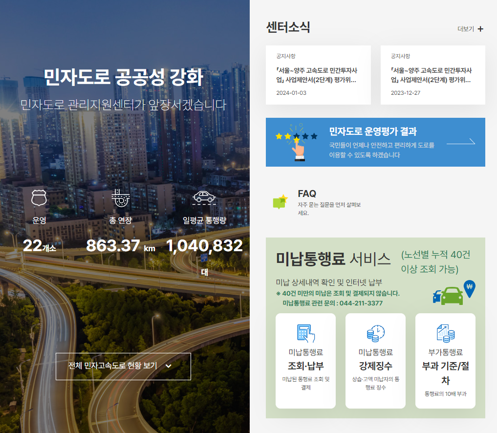 다음으로는 민자도로관리지원센터를 기준으로 요금 조회 및 납부 방법을 알려드리겠습니다.